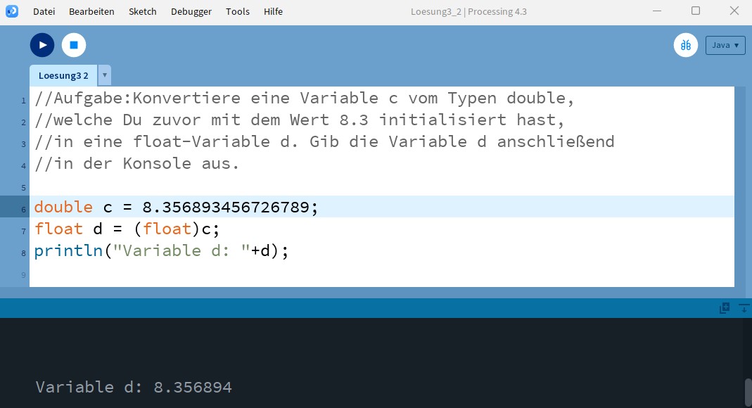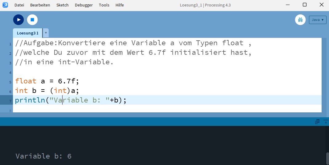 Der Typ int ist für Ganzahlen bestimmt, er kann Kommazahl nicht darstellen. Das heißt die Informationen hinter dem Komma gehen verloren, sie werden einfach abgeschnitten. Ein solche Konvertierung muss angewiesen werden. Dazu gibt es zwei verschiedene Möglichkeiten. Im unteren Beispiel wird der Datentyp, in den konvertiert werden soll, in Klammern vor die zu konvertierende Variable geschrieben. Dieser Vorgang nennt sich "Cast".