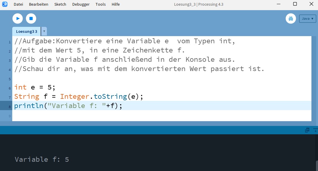 Da im obigen Fall auch Fehler auftreten können, z.b. wenn es sich nicht um Zeichen handelt, die in eine Zahl umgewandelt werden können, wäre hier eigentlich eine Fehlerbehandlung nötig, falls dieser Wert von einem Nutzer eingegeben würde. Aber dazu später mehr.
