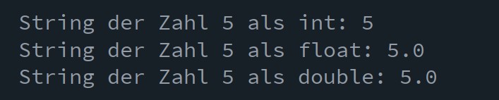 Die Konvertierung von Strings in Primitive Datentypen funktioniert nicht via Cast. Wir haben bereits gelernt, dass String eine Klasse ist und Variablen des Typs String verweisen auf Objekte dieser Klasse. Es sind keine Variablen primitiver Typen. Da wir uns das Thema "Objektorientierung" noch nicht angeschaut haben, wird es bis dahin noch nicht ganz zu verstehen sein.