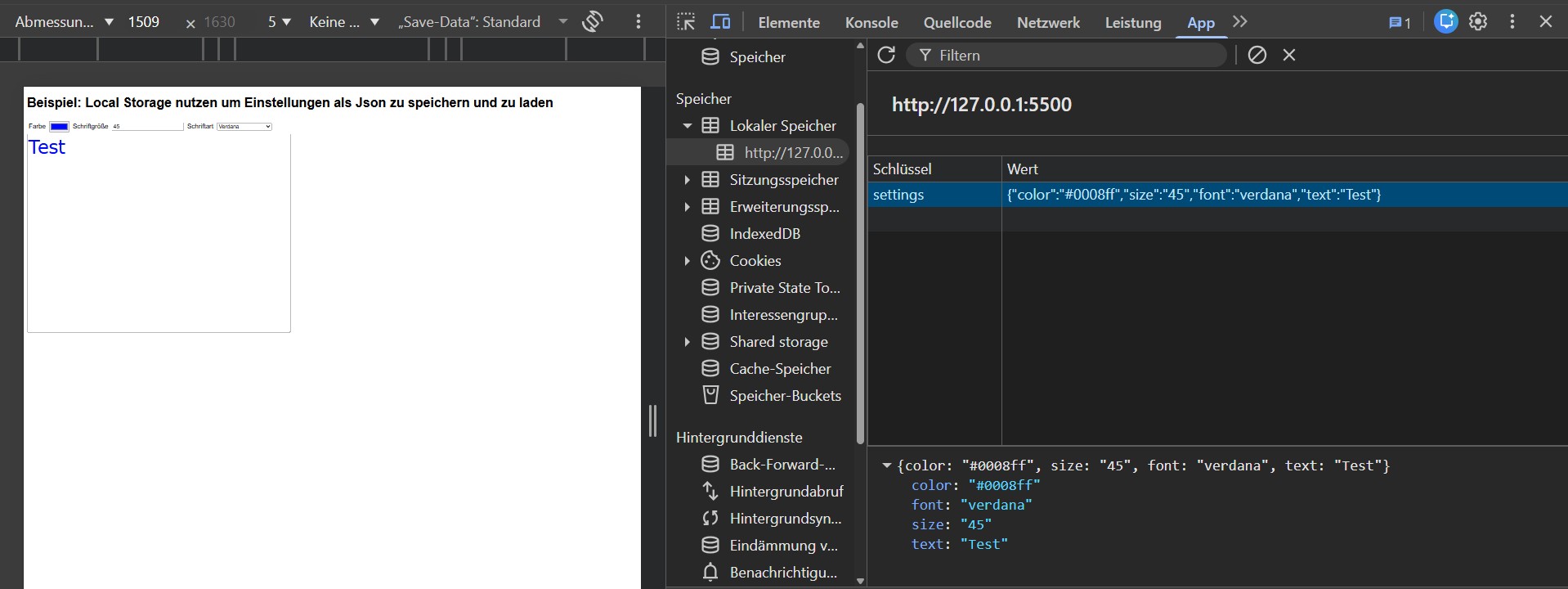 Wenn die Seite nun genutzt wird, werden bei einer Änderung der Daten, diese immer aktuell im LocalStorage gespeichert. Das lässt sich in der Entwicklerkonsole (F12) einfach prüfen.