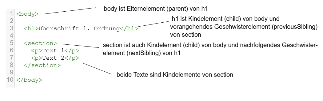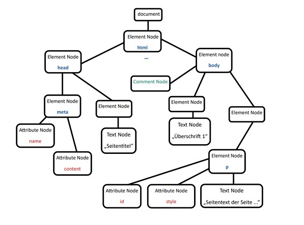 Die Baumstruktur ist durch verschiedene Knoten (Nodes) abgebildet. Dabei unterscheidet man Dokumenttyp-Knoten (<!DOCTYPE html>), Dokumentknoten (Elternknoten von html), Elementknoten, Textknoten, Attributknoten und Kommentarknoten. Man kann sich das bildlich etwa so vorstellen: